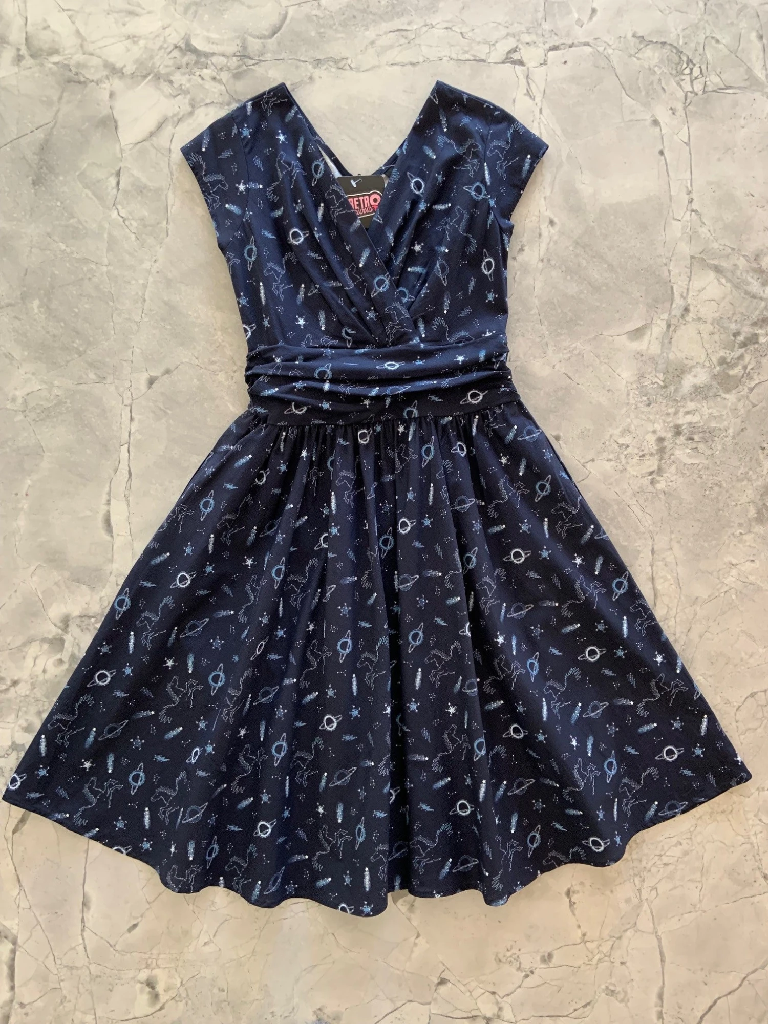 Looking for a classic yet comfortable 1950’s style dress? The Greta is everything you could want and more! Shown in our Sky Full of Stars print, this vintage style cotton dress features a gathered surplice neckline, cummerbund waist with figure flattering gathers, a vintage inspired twirl-worthy skirt with hidden side pockets, and a back zippered closure.