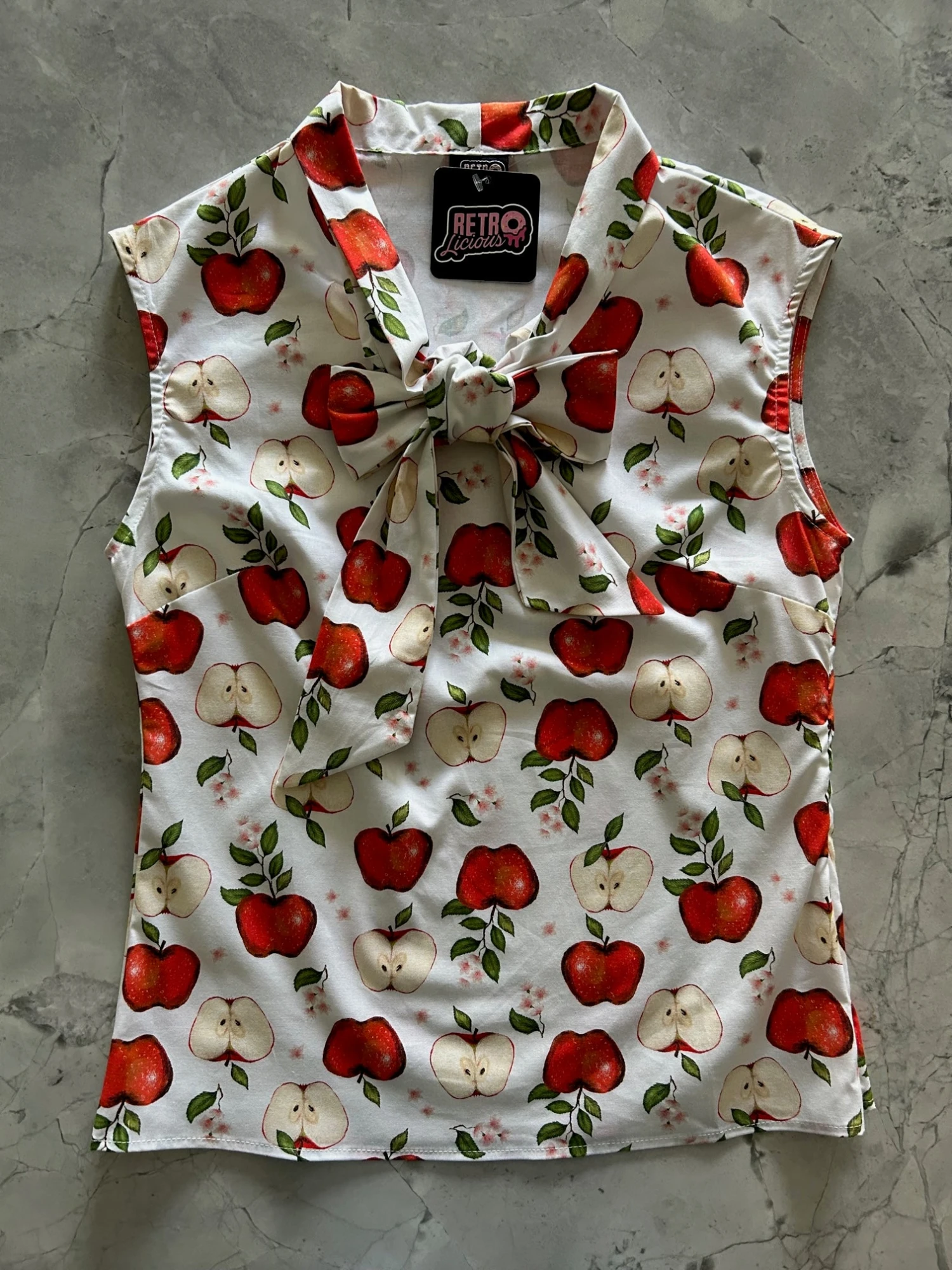 This top is for the vintage lover at heart! Now available in our delicious apple print. This 100% cotton top features bust darts for a flattering silhouette, a side zippered closure for ease of wear, and an oversized bow at the neckline for that perfect 1950’s inspired look.