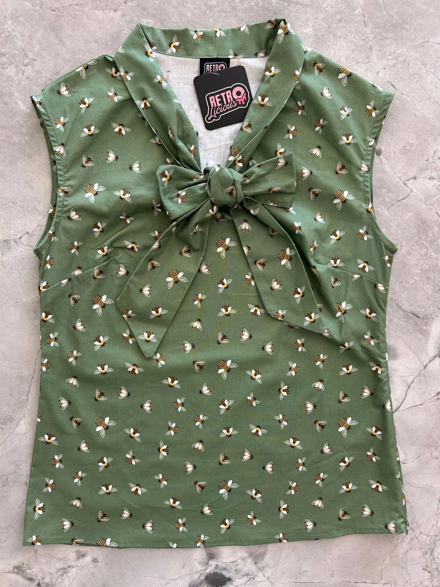 This top is for the vintage lover at heart! Now available in our Bee print. This 100% cotton top features bust darts for a flattering silhouette, a side zippered closure for ease of wear, and an oversized bow at the neckline for that perfect 1950’s inspired look.