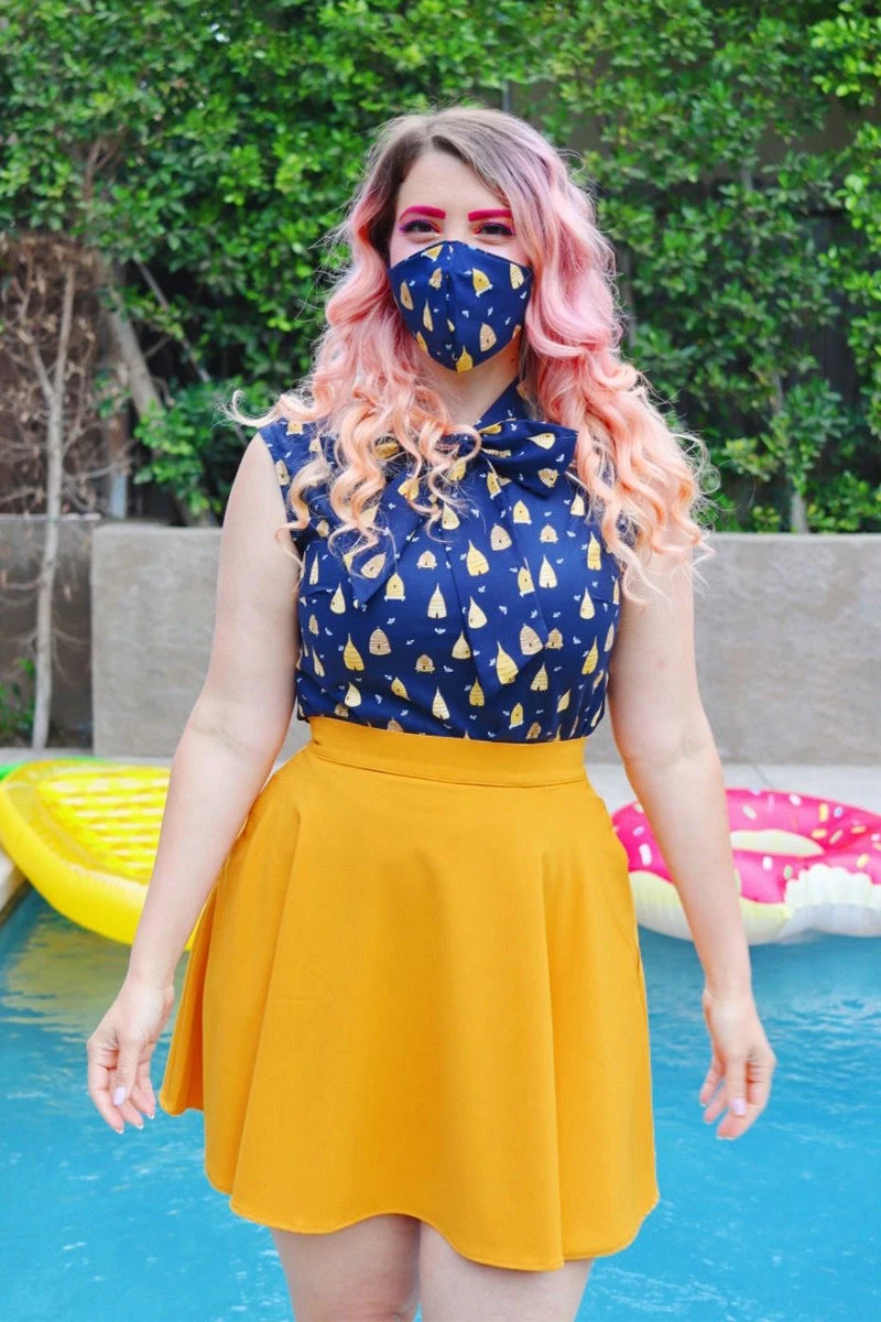 This top is for the vintage lover at heart! Shown in our beehive print, this 100% cotton top features bust darts for a flattering silhouette, a side zippered closure for ease of wear, and an oversized bow at the neckline for that perfect 1950’s inspired look.