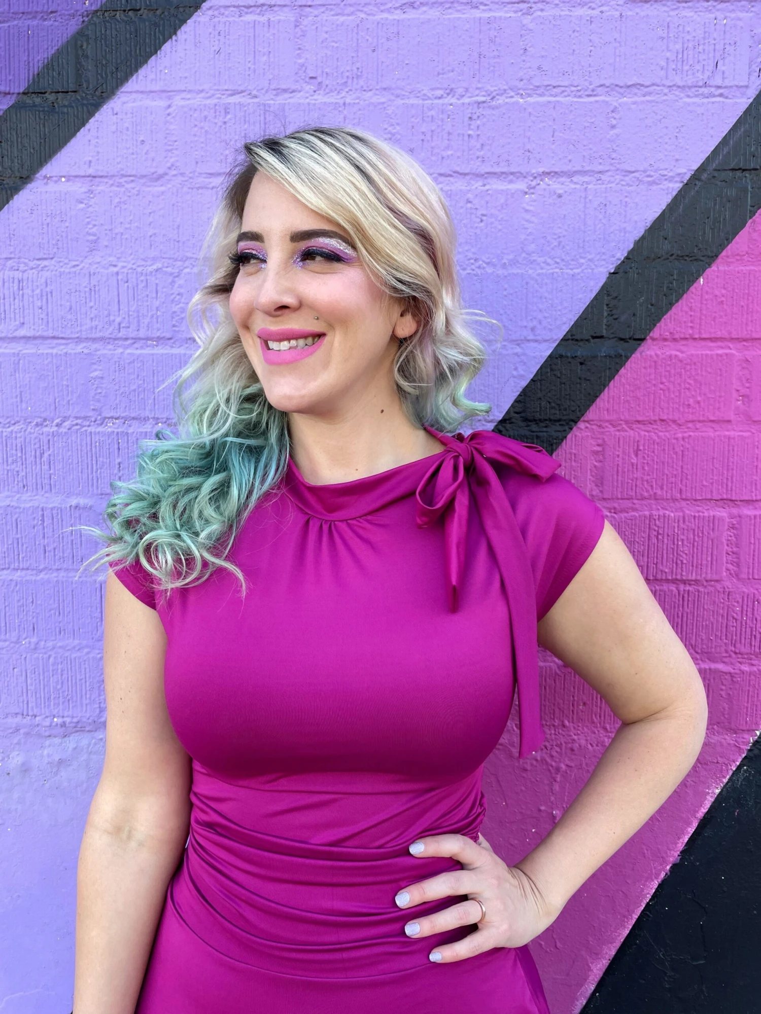 Show off your inner pinup in our new magenta bombshell dress! Known for comfort without compromising style; the bombshell boasts a side tie on the neckline, short sleeves, figure-flattering shirring detail on the waist, and hidden side pockets. The fabric is smooth and stretchy, so you can rock your favorite retro look from work to play and beyond!