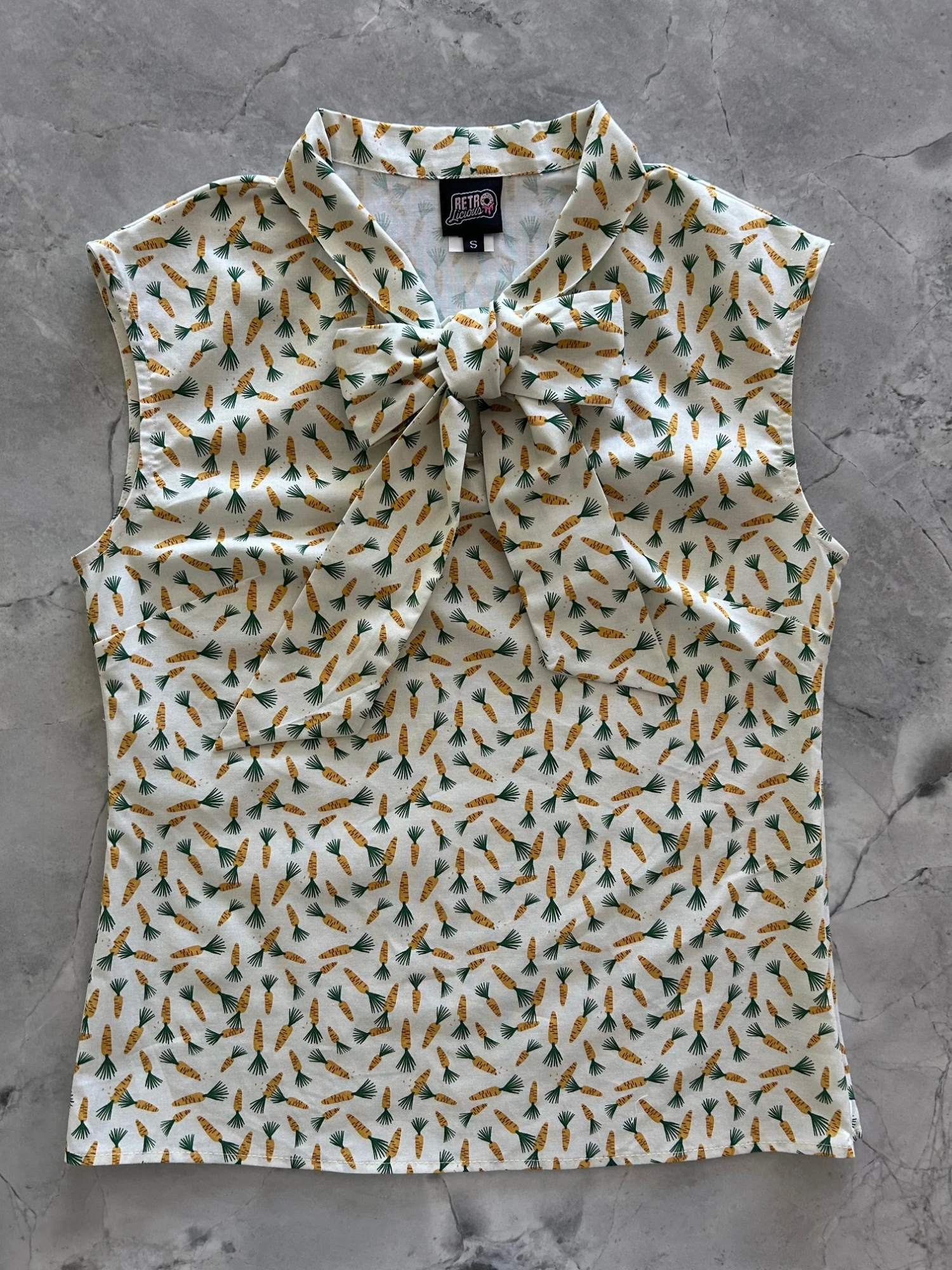 This top is for the vintage lover at heart! Now available in our Carrots print. This 100% cotton top features bust darts for a flattering silhouette, a side zippered closure for ease of wear, and an oversized bow at the neckline for that perfect 1950’s inspired look.