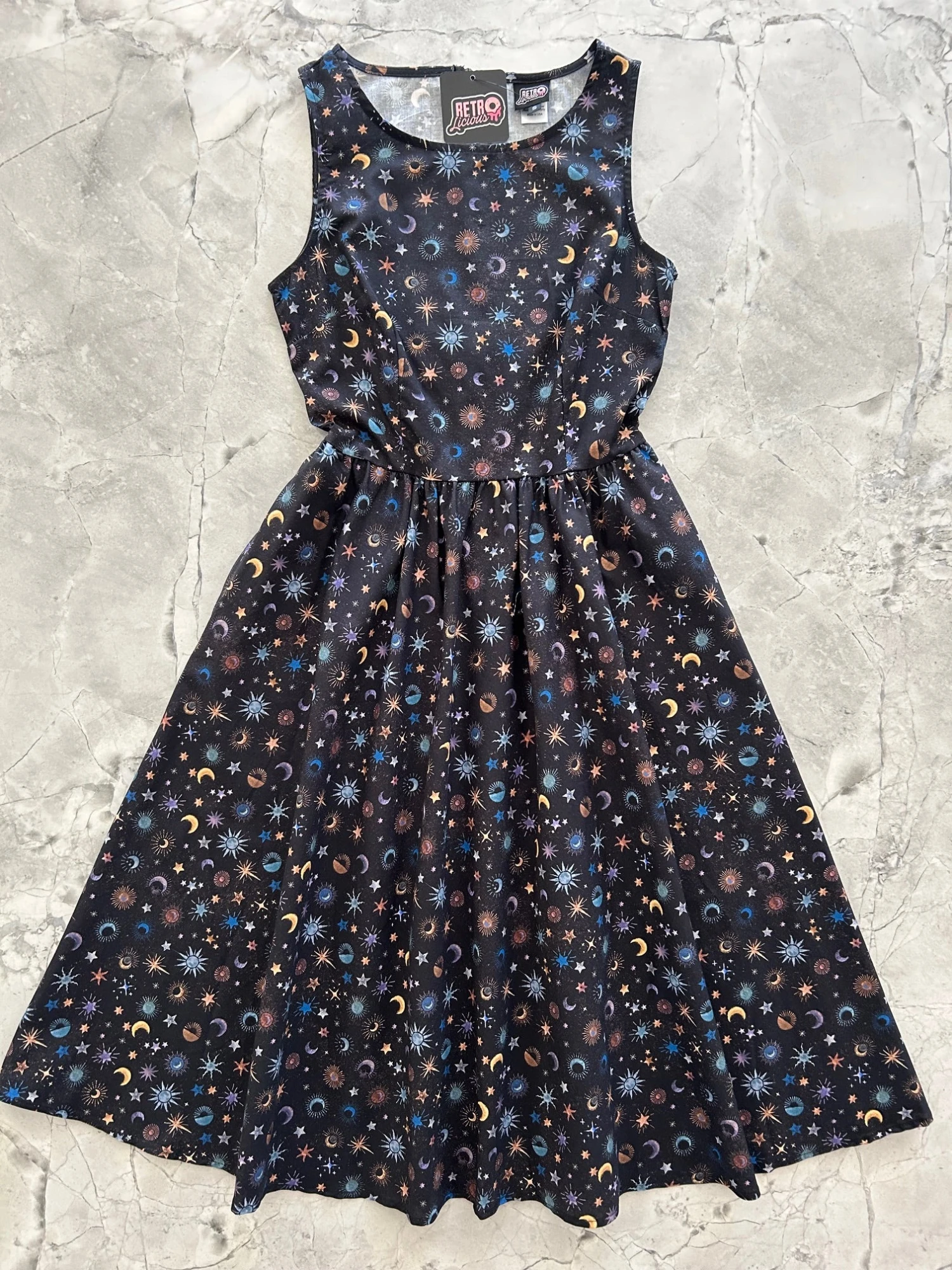 A vintage style piece with fun, modern details; our midi dress is now available in our Celestial print. Made from 100% cotton, this classic 1950’s inspired dress features a high neckline, longer length swing skirt with hidden side pockets, and back zippered closure.