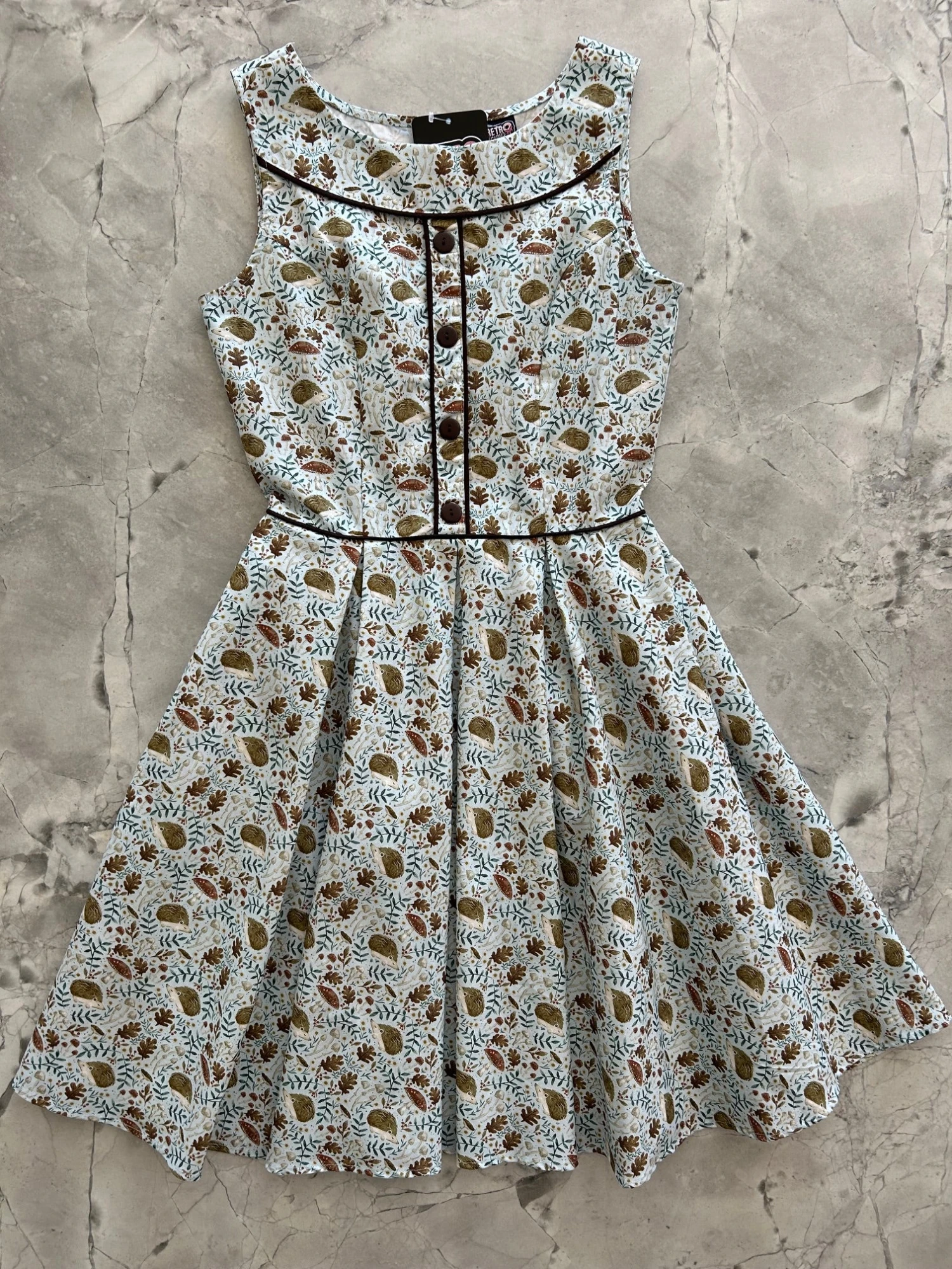 Looking for a classic vintage style dress? Our Elizabeth cut with all its details is everything you could want and more! Shown in our Hedgehogs print, this cotton dress features piping details throughout the bodice with front non-functional buttons, waist with figure flattering pleats, a vintage inspired twirl-worthy skirt with hidden side pockets, and a back zippered closure.