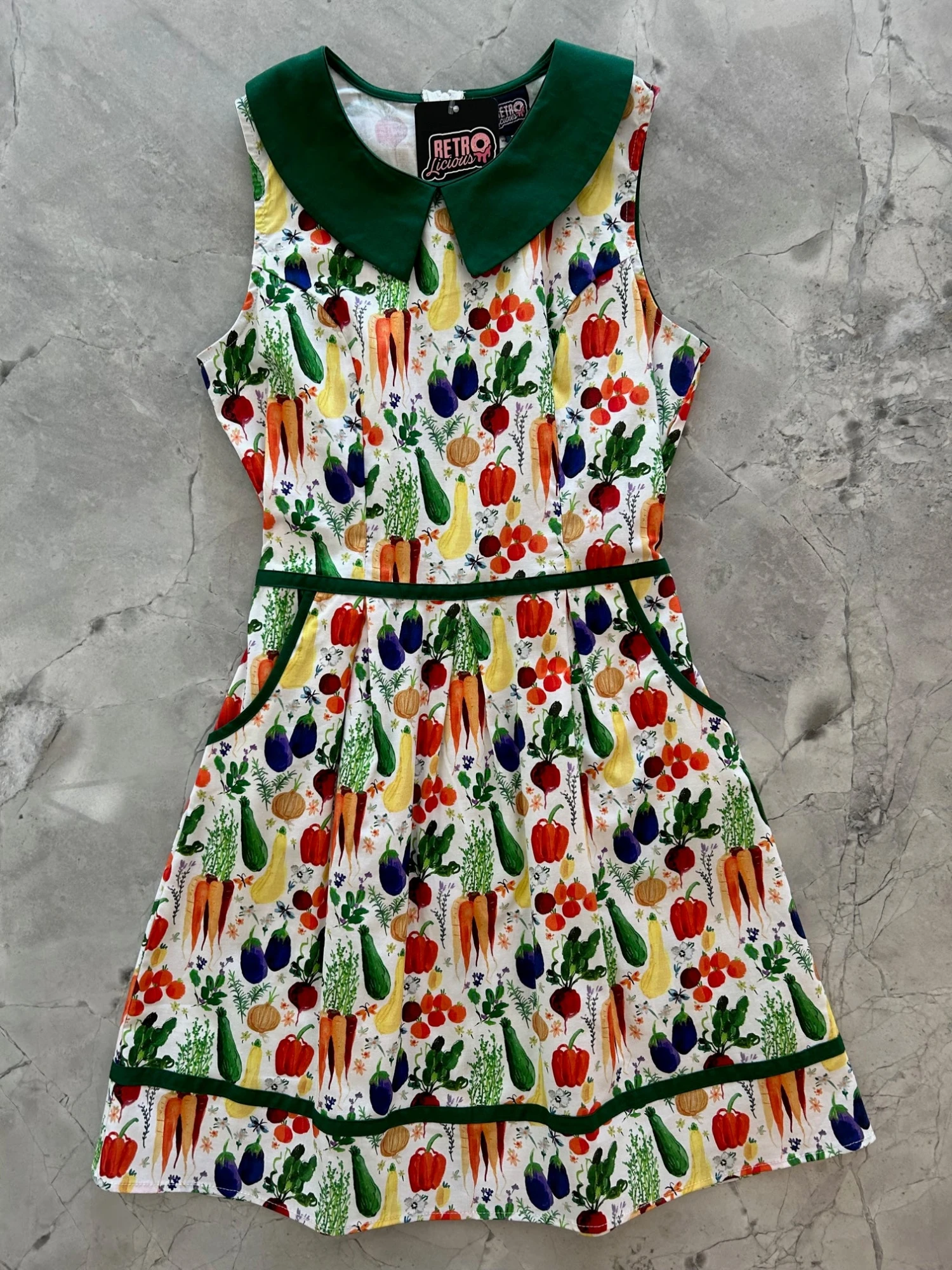 Fun and totally functional, this retro dress is bound to be your new favorite! Shown in our Farm to Table print, this 60s style cotton dress features a contrast Peter Pan collar, contrast piping throughout, a-line skirt with side pockets, and a back zippered closure.