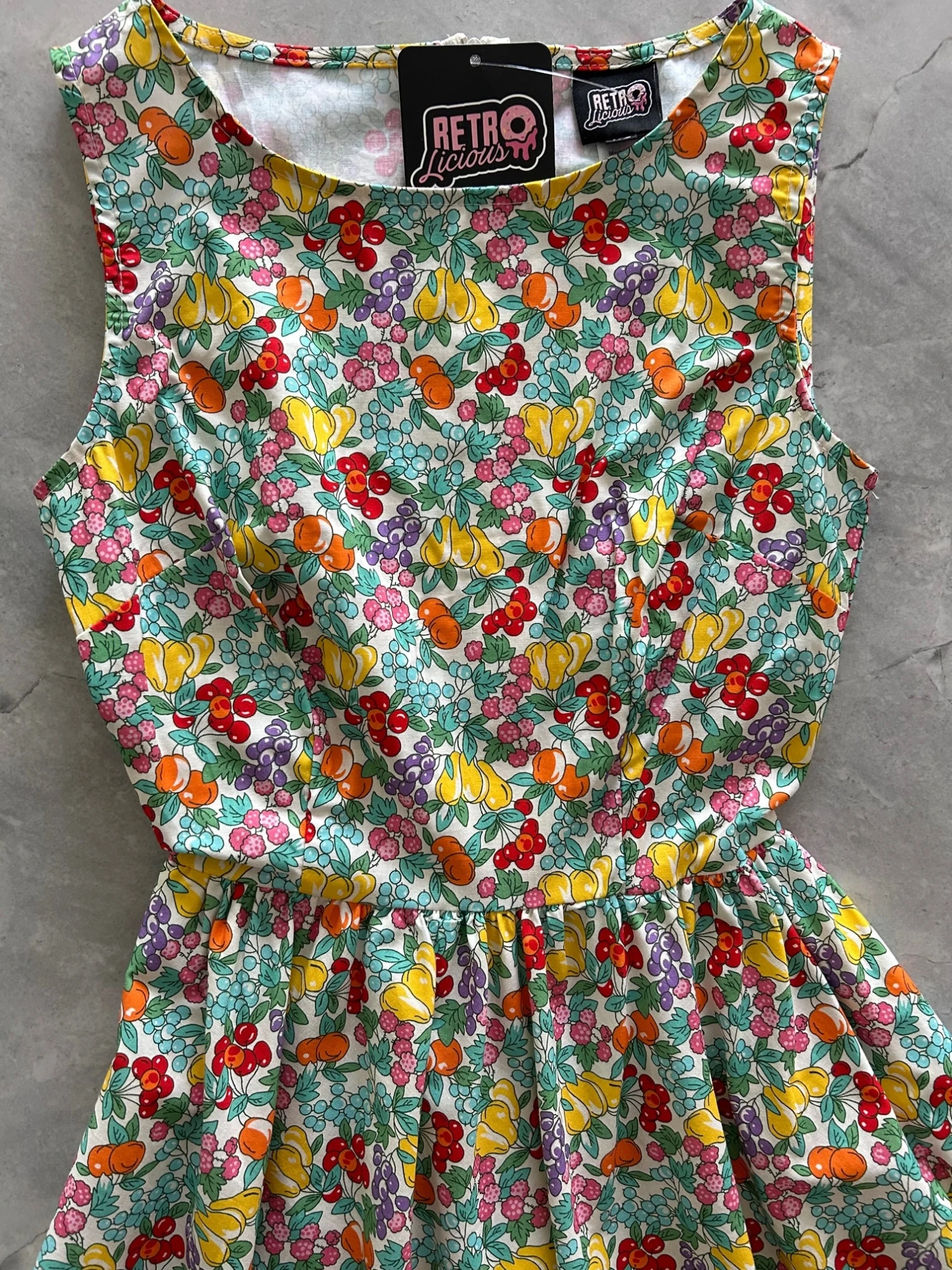 A vintage style piece with fun, modern details; our midi dress is now available in our retro Farmer’s Market print. Made from 100% cotton, this classic 1950’s inspired dress features a high neckline, longer length swing skirt with hidden side pockets, and back zippered closure.