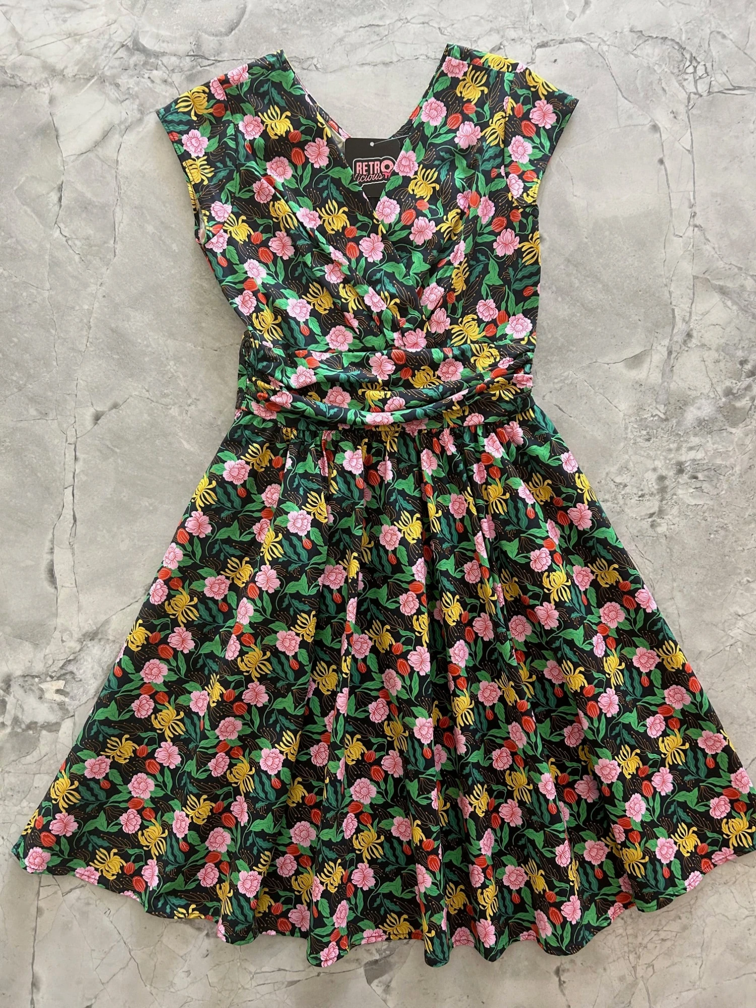 The Greta is everything you could want and more! Shown in our Floral print, this vintage style cotton dress features a gathered surplice neckline, cummerbund waist with figure flattering gathers, a vintage inspired twirl-worthy skirt with hidden side pockets, and a back zippered closure.