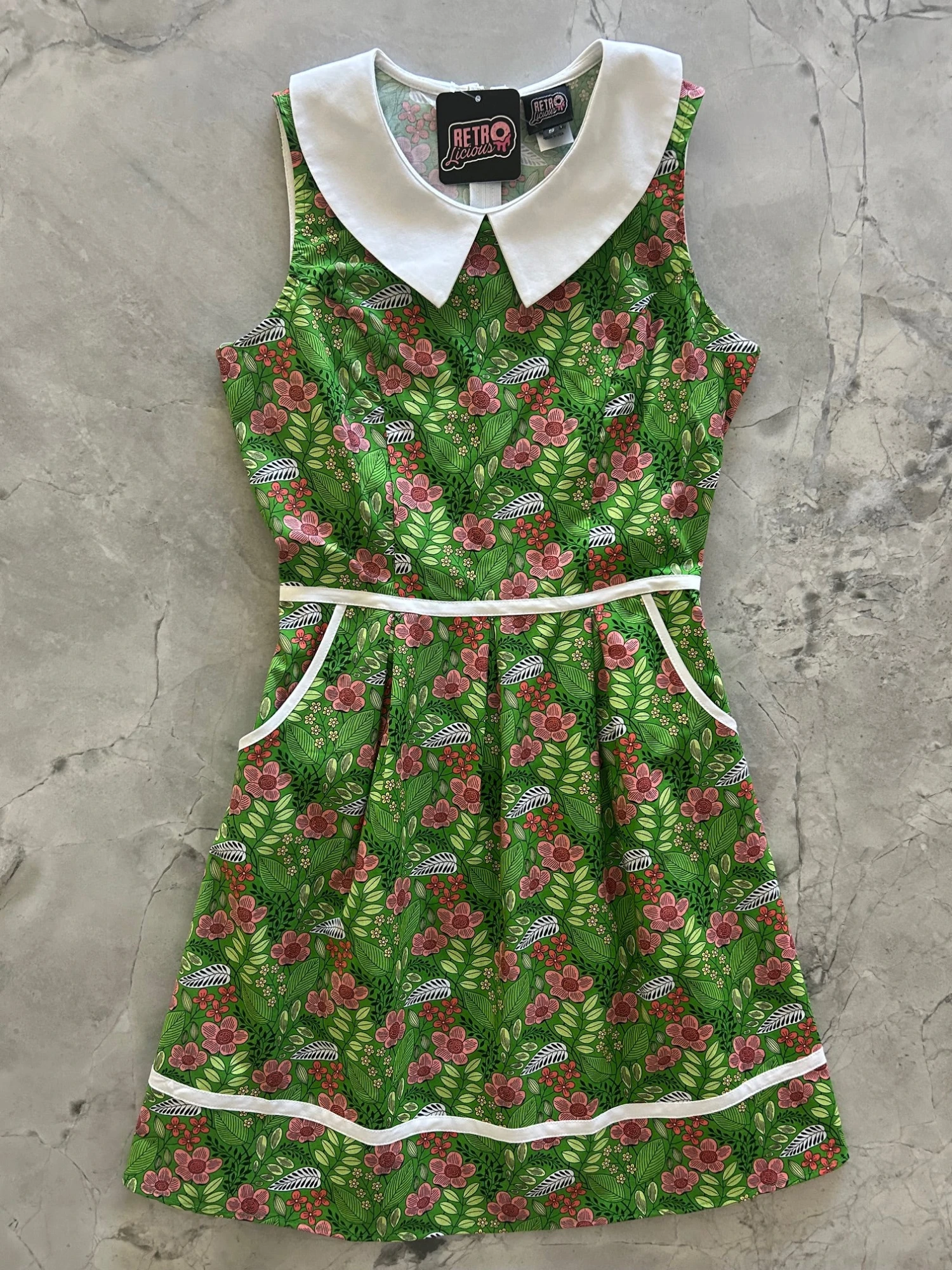 Fun and totally functional, this retro dress is bound to be your new favorite! Shown in our Flowers print, this 60s style cotton dress features a contrast Peter Pan collar, contrast piping throughout, a-line skirt with side pockets, and a back zippered closure.