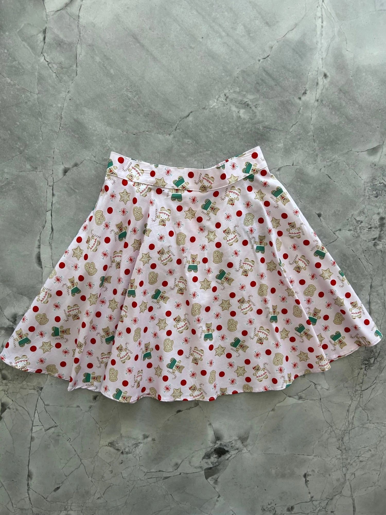 The ultimate fun and flirty skirt! Shown in our Gingerbread Kitties print, this vintage style skirt features an elasticized back waist for ease of wear and a back zippered closure.