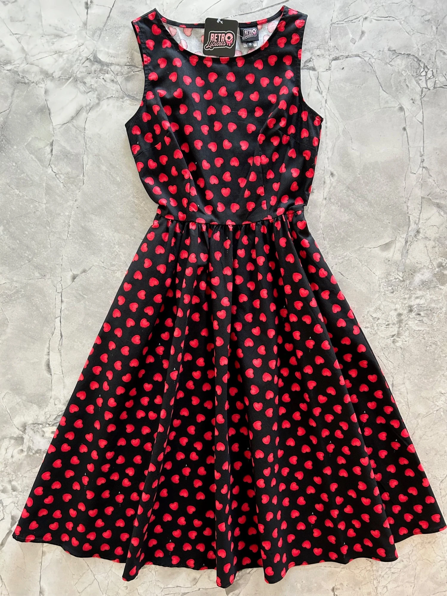 A vintage style piece with fun, modern details; our midi dress is now available in our Hearts print. Made from 100% cotton, this classic 1950’s inspired dress features a high neckline, longer length swing skirt with hidden side pockets, and back zippered closure.