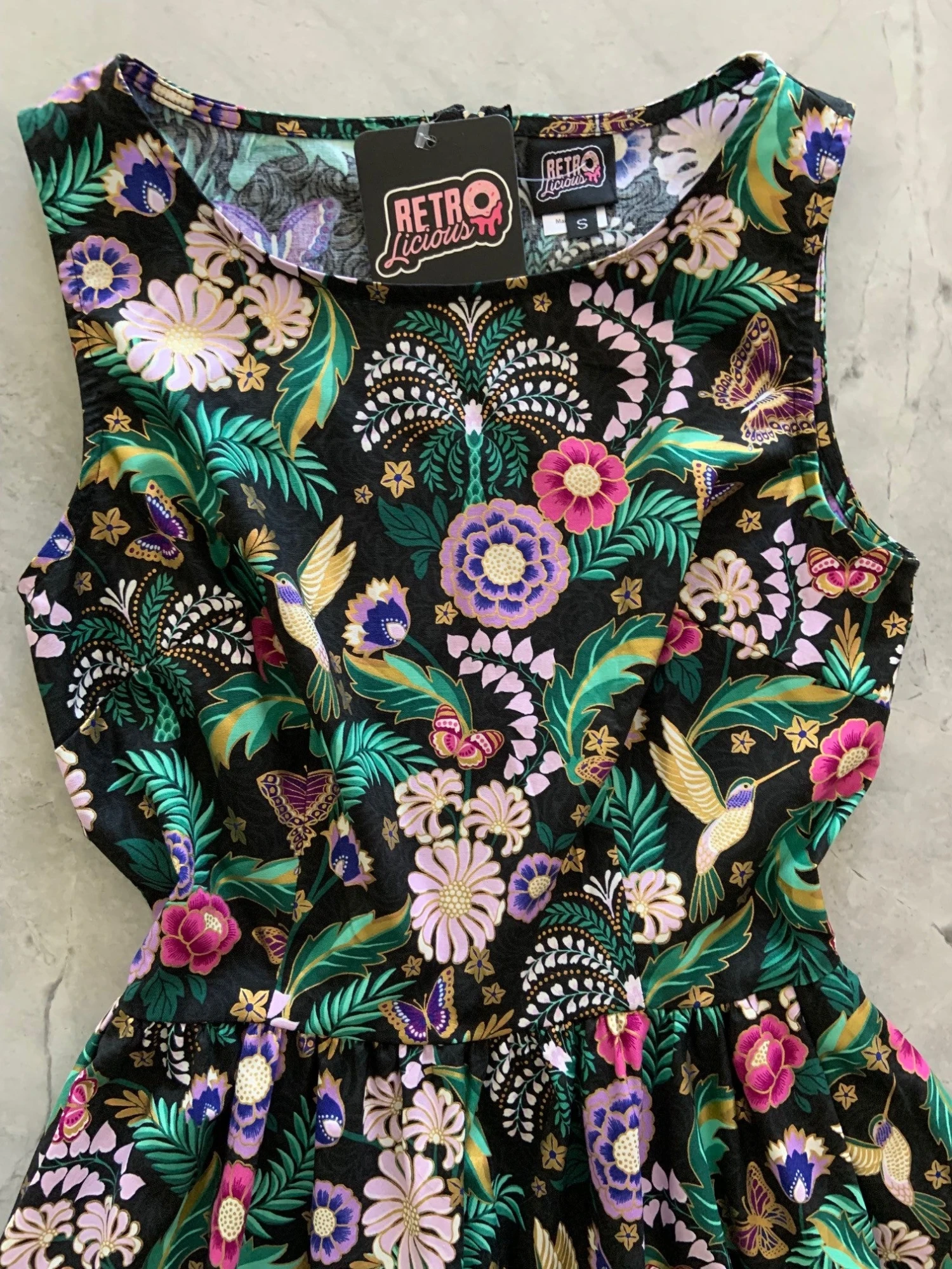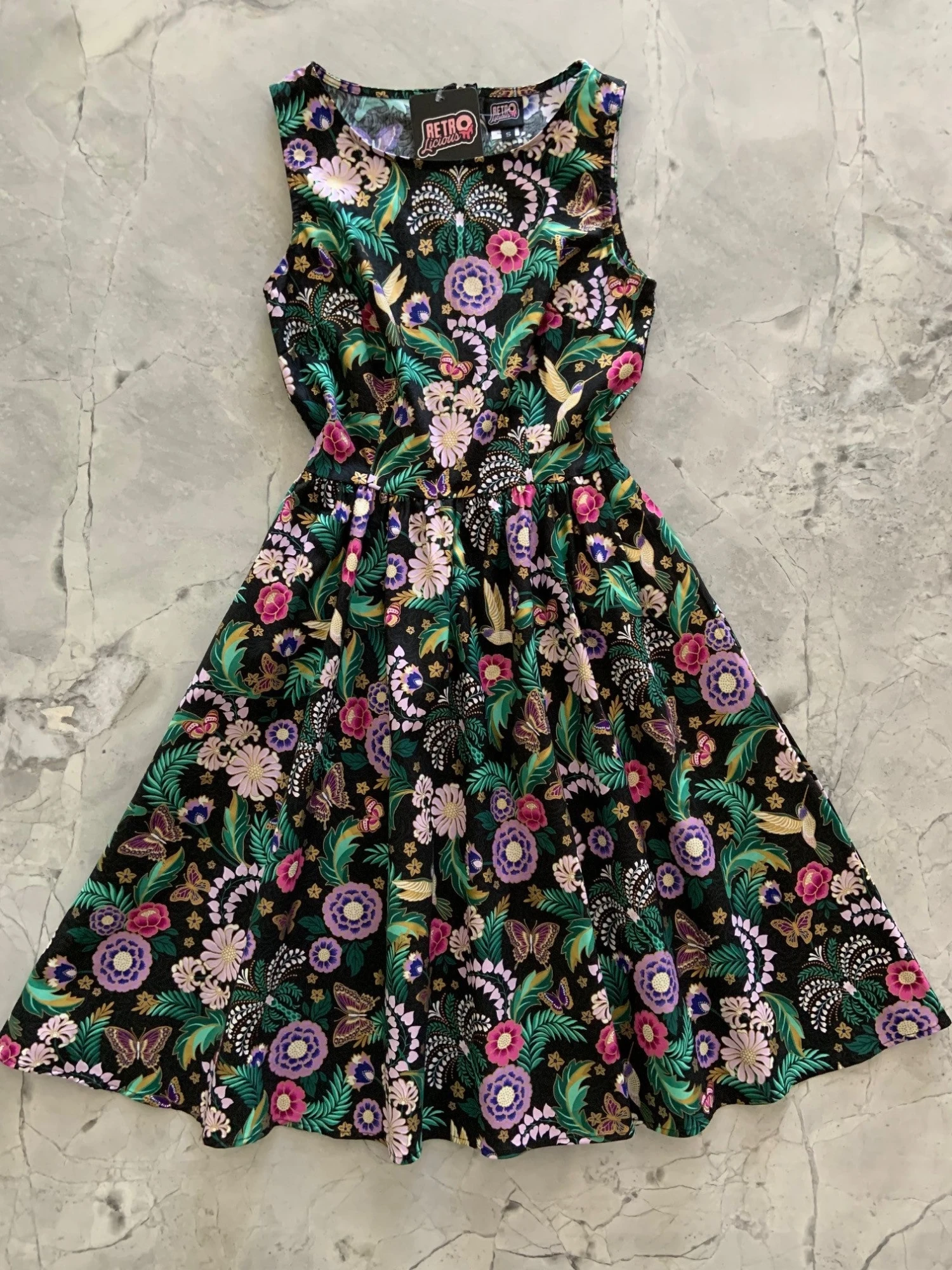 Experience the magic of the 1950s with our Hummingbird Vintage Dress. Adorned with whimsical hummingbirds and butterflies, this dress captures the essence of retro charm. The metallic print details add a touch of glamour, making it perfect for special occasions or vintage-inspired events. Step into the world of timeless elegance and grace with this enchanting dress. Shop now and let your style take flight with the Hummingbird Vintage Dress.