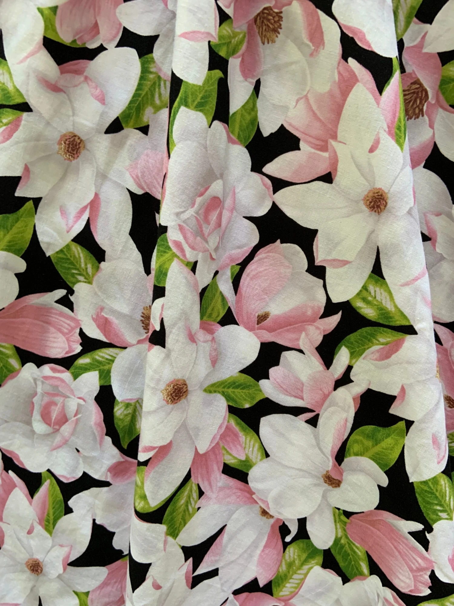 A vintage style piece with fun, modern details; our midi dress is now available in our pretty magnolia print. Made from 100% cotton, this classic 1950’s inspired dress features a high neckline, longer length swing skirt with hidden side pockets, and back zippered closure.