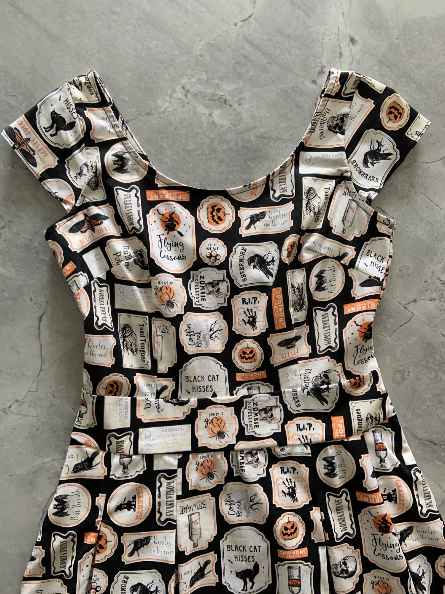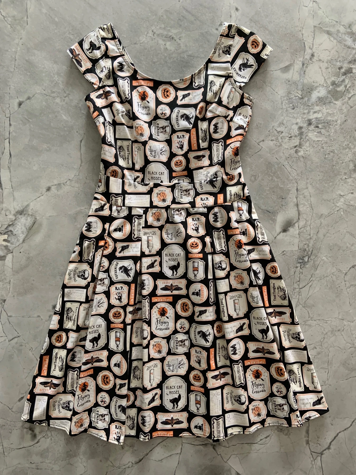 Classy and elegant, the Margaret dress is flattering and comfortable. Shown in our ghoulish Halloween print, this vintage style cotton dress features cap sleeves, inverted pleats, a-line skirt with side pockets, and a back zippered closure.