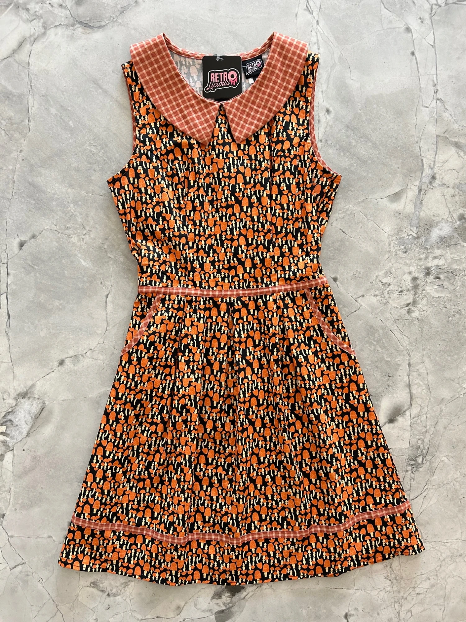 Fun and totally functional, this retro dress is bound to be your new favorite! Shown in our Mushroom print, this 60s style cotton dress features a contrast Peter Pan collar, contrast piping throughout, a-line skirt with side pockets, and a back zippered closure.
