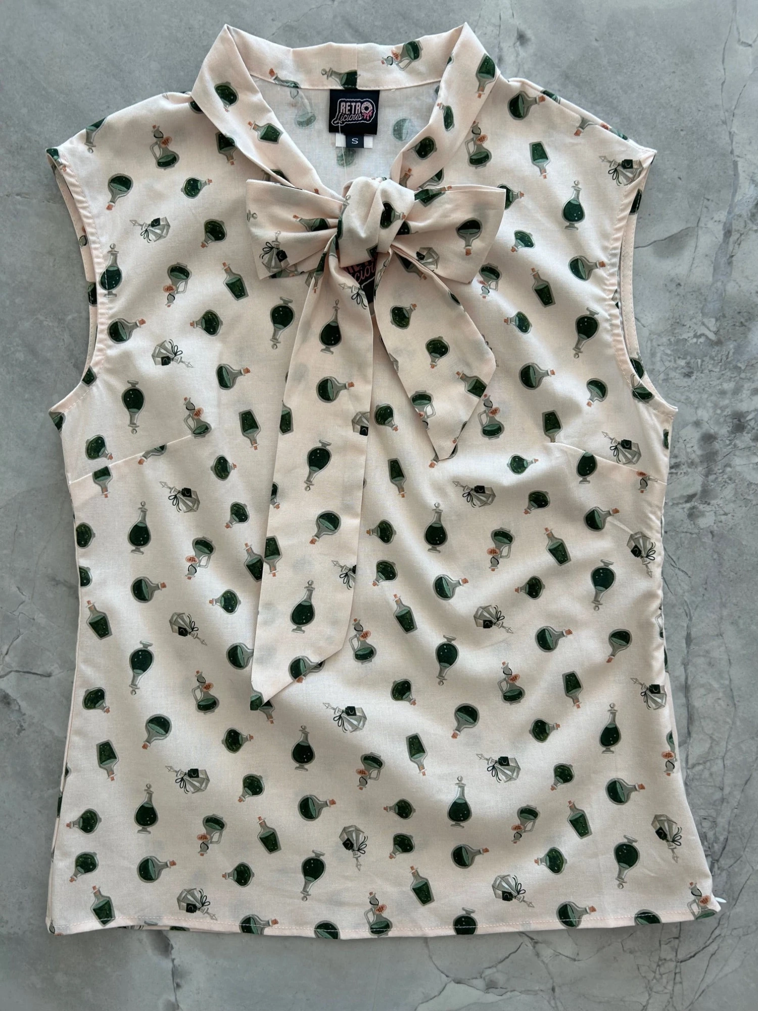 This top is for the vintage lover at heart! Now available in our Potions print. This 100% cotton top features bust darts for a flattering silhouette, a side zippered closure for ease of wear, and an oversized bow at the neckline for that perfect 1950’s inspired look.