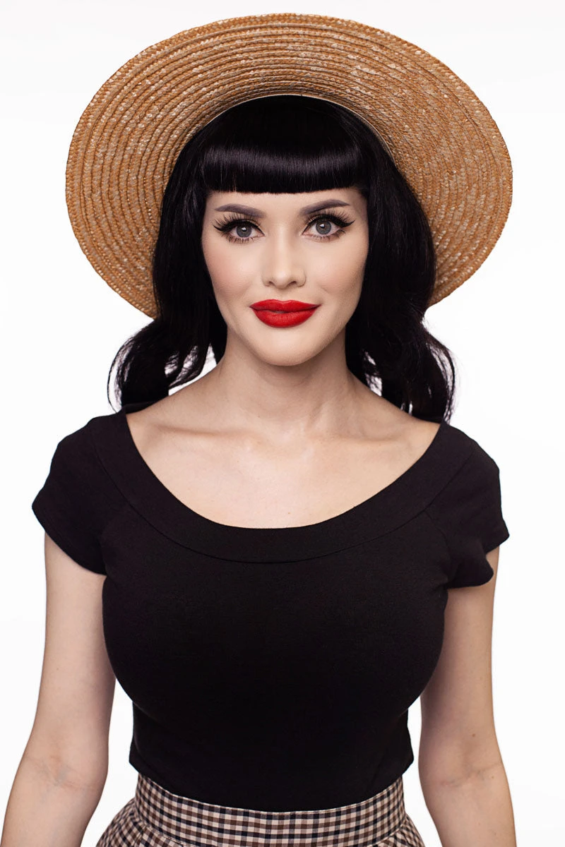 Looking for a go-to vintage style top? Well look no further: our boat neck top is a 1950’s staple with modern features! Shown in classic black, this super soft and stretchy top features a figure-flattering wide boat neckline, cap sleeves, and is a pullover style with no zippers or buttons. Pair with a swing skirt for the ultimate retro ensemble or your favorite jeans. The options are endless!