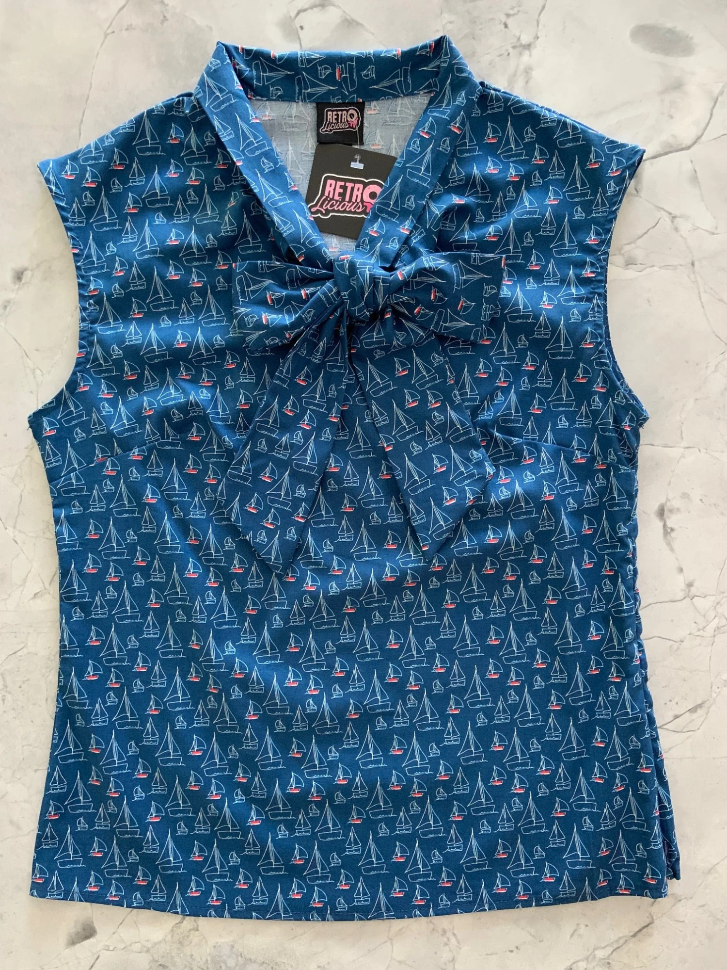This top is for the vintage lover at heart! Shown in our sailboats print, this 100% cotton top features bust darts for a flattering silhouette, a side zippered closure for ease of wear, and an oversized bow at the neckline for that perfect 1950’s inspired look.