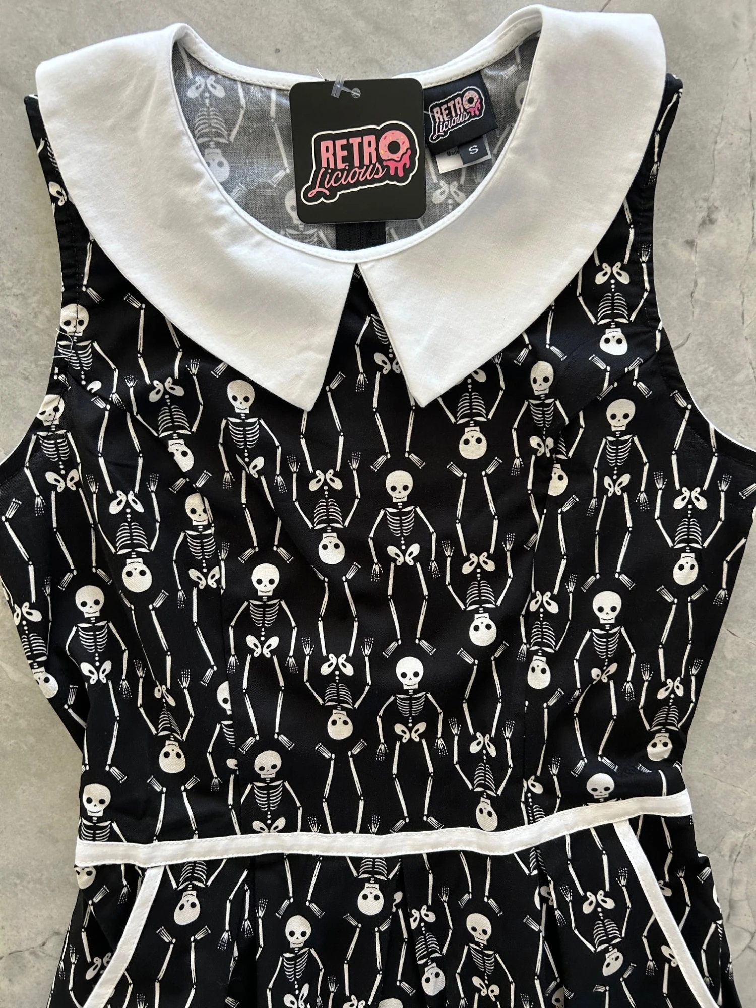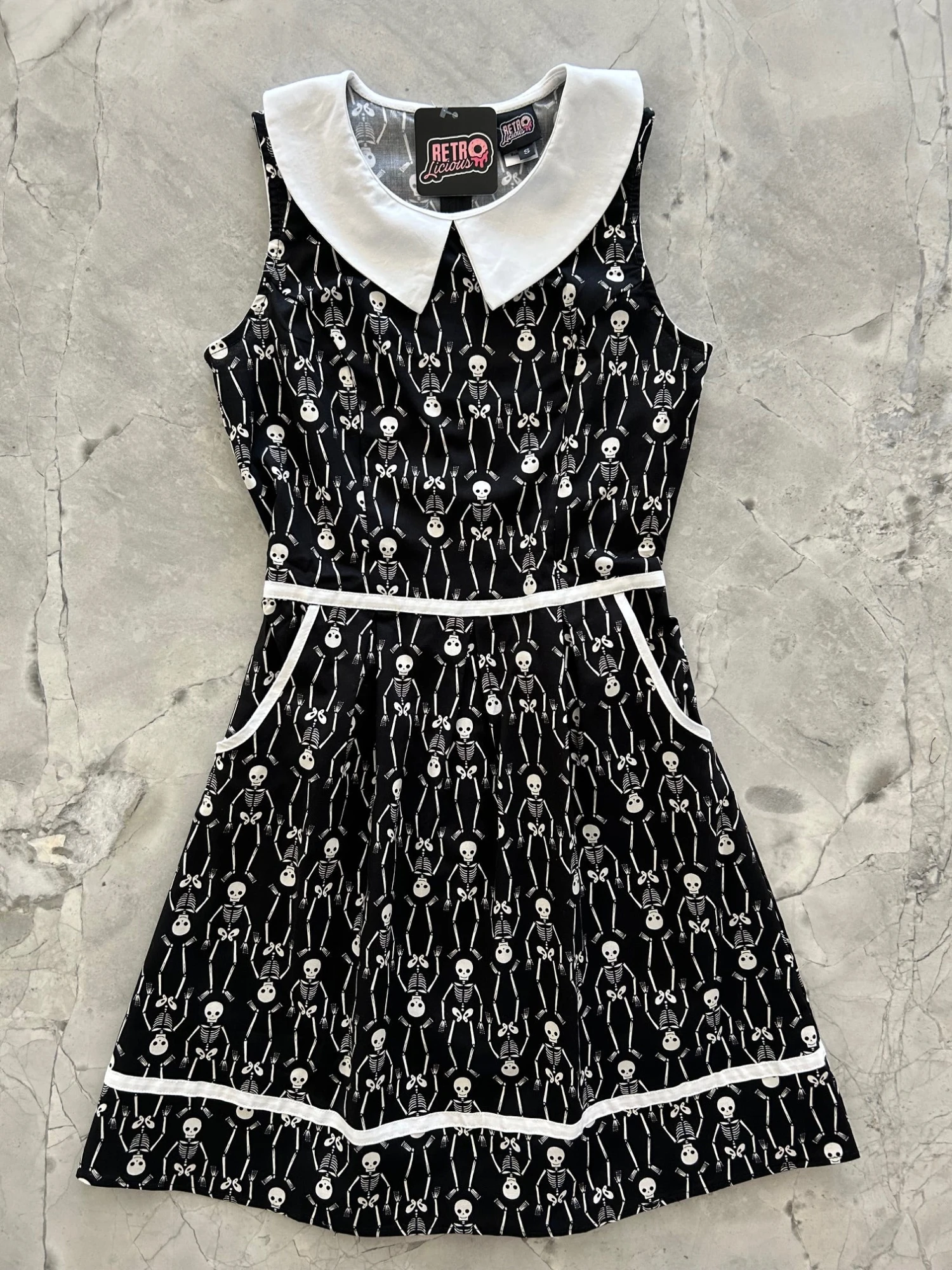 Fun and totally functional, this retro dress is bound to be your new favorite! Shown in our Skeleton print, this 60s style cotton dress features a contrast Peter Pan collar, contrast piping throughout, a-line skirt with side pockets, and a back zippered closure.