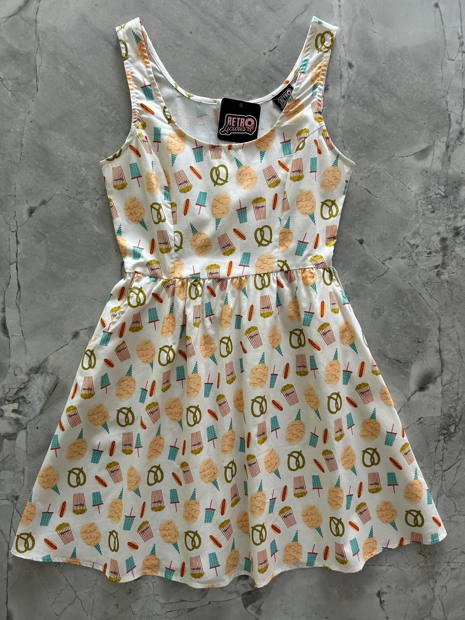Embrace retro charm with our Snacks Shorter Length Fit & Flare Dress. Featuring a tossed pattern of carnival treats, this dress transports you to a playful vintage era. The fit & flare silhouette adds a touch of femininity, making it perfect for any occasion. Shop now and let your style shine!