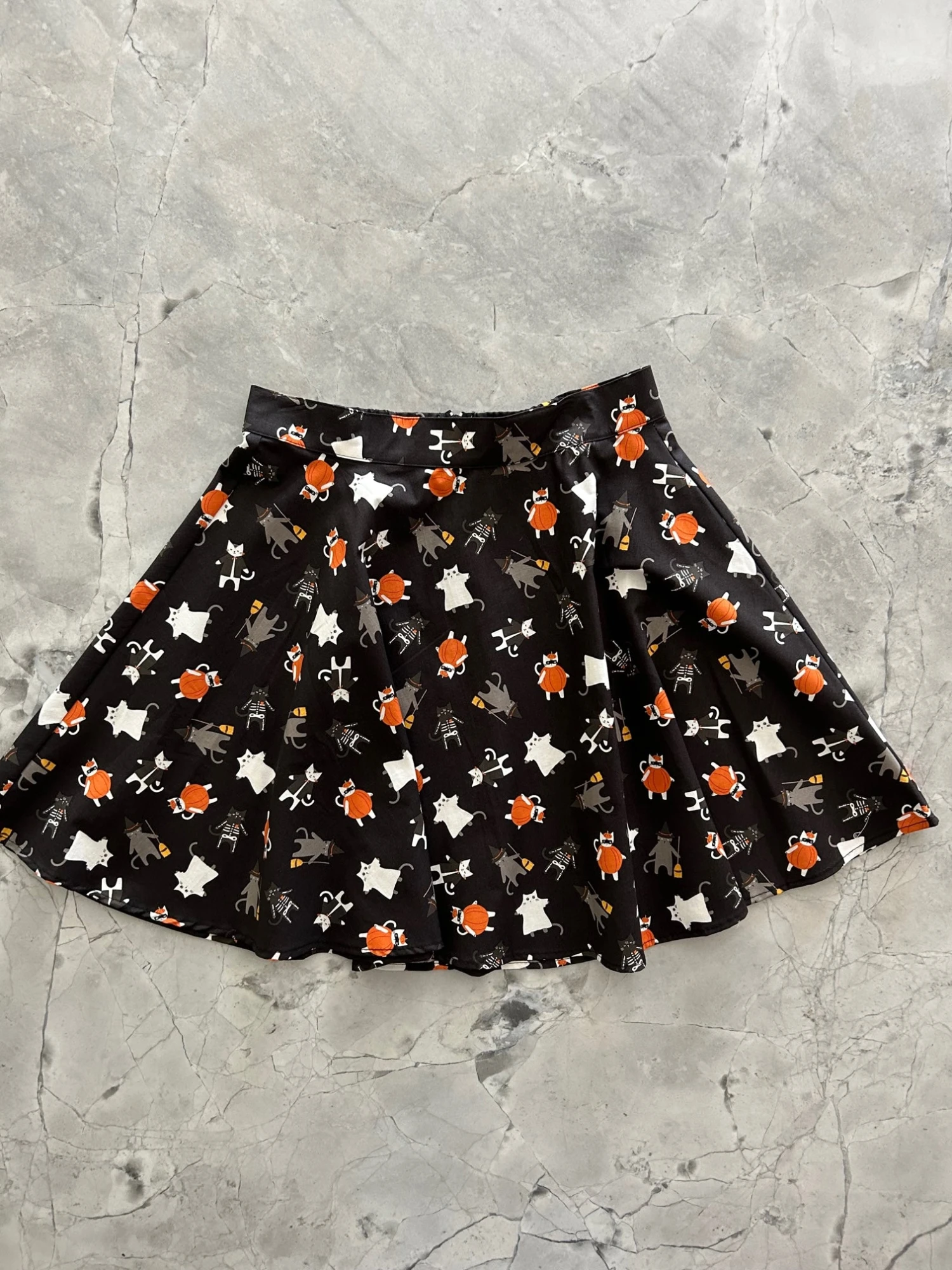 The ultimate fun and flirty skirt! Shown in our Spooky Cats print, this vintage style skirt features an elasticized back waist for ease of wear and a back zippered closure.