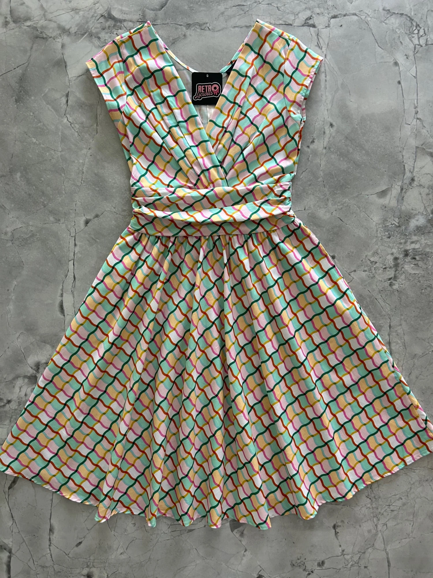 The Greta is everything you could want and more! Shown in our Squiggly print, this vintage style cotton dress features a gathered surplice neckline, cummerbund waist with figure flattering gathers, a vintage inspired twirl-worthy skirt with hidden side pockets, and a back zippered closure.