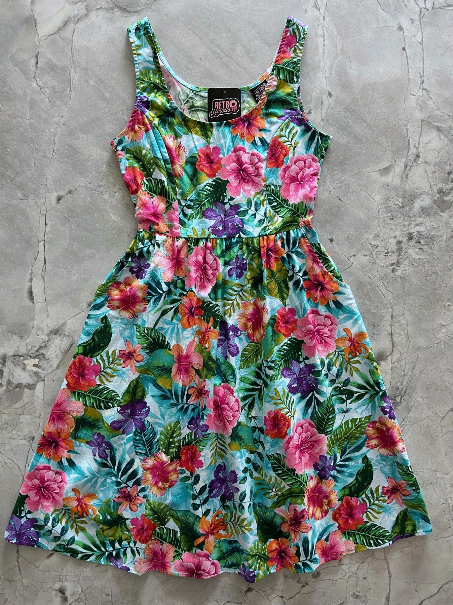 Elevate your retro style with our Tropical Fit & Flare Dress. Adorned with vibrant tropical flowers , this longer-length dress captures the whimsy of vintage fashion. The fit & flare silhouette adds a touch of elegance, making it perfect for any occasion. Step into a world of nostalgic charm and make a statement with the Tropical Fit & Flare Dress. Shop now and embrace retro style with a tropical twist.