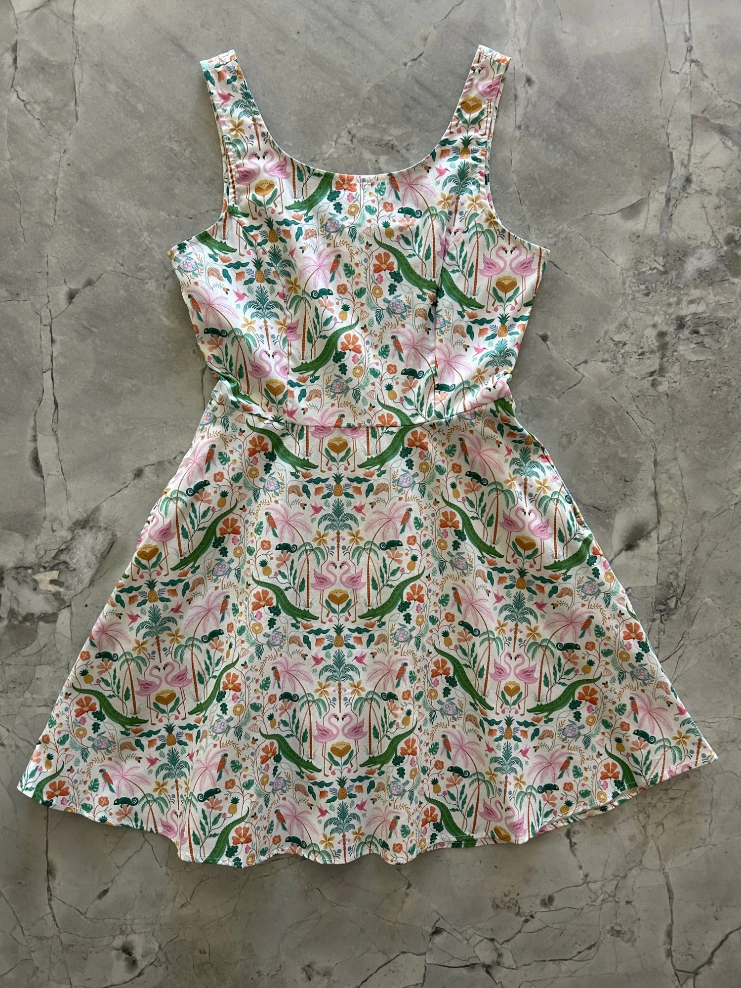 Fun, flirty, and totally retro: our skater dress is the perfect addition to your closet! Shown in our Tropical print, this vintage inspired dress features a scoop front and back, elasticized waist in the back for ease of wear, a flirty a-line skirt with hidden side pockets, and a back zippered closure.