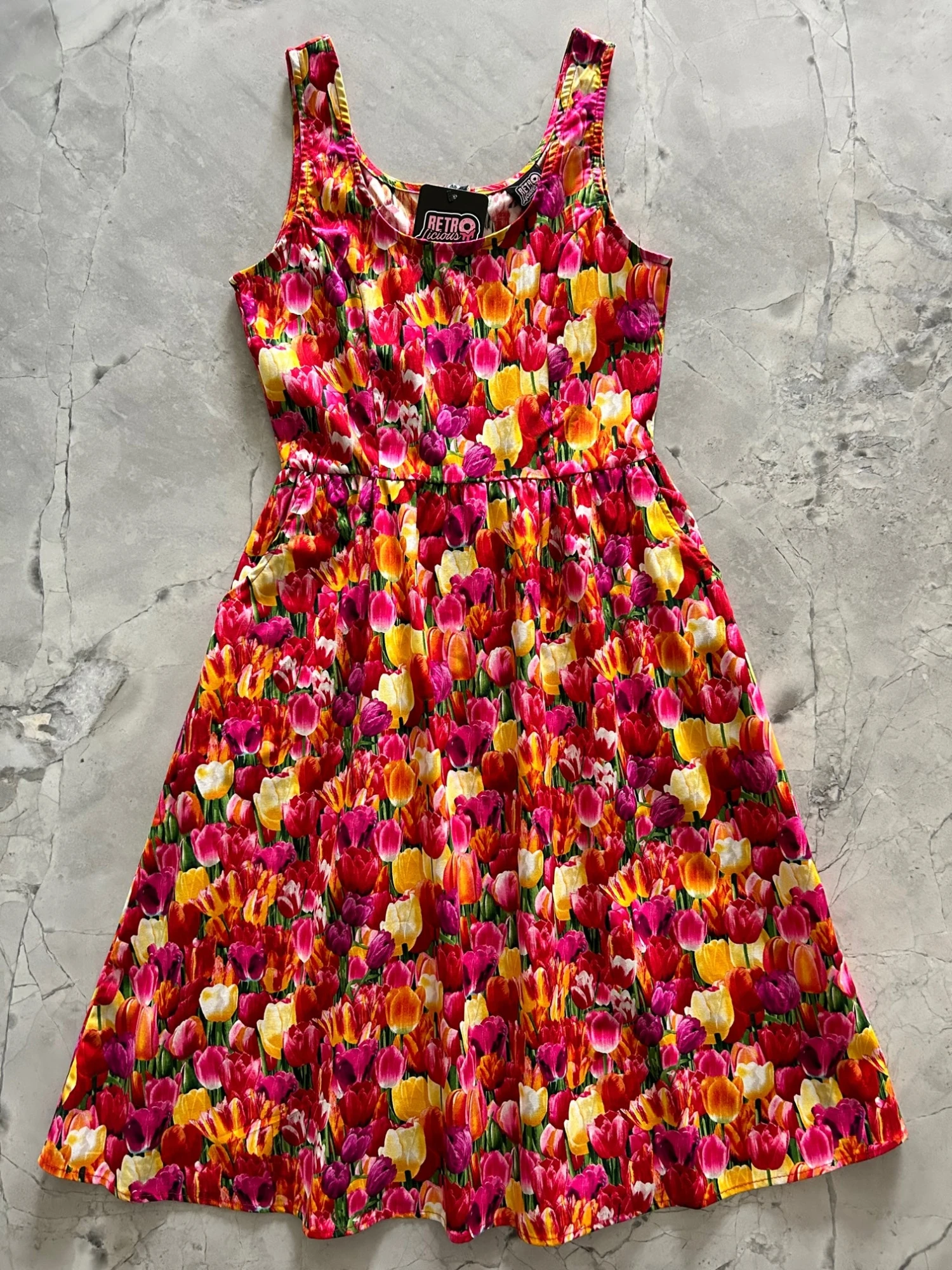 For all of our tulip lovers out there, we have a new dress for you! This vintage inspired dress features a scoop front and back, elasticized back waist for ease of wear, longer length a-line skirt with hidden side pockets, and back zippered closure.