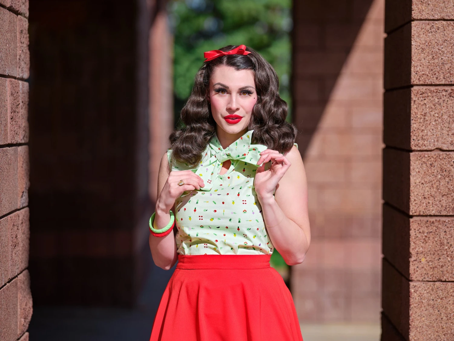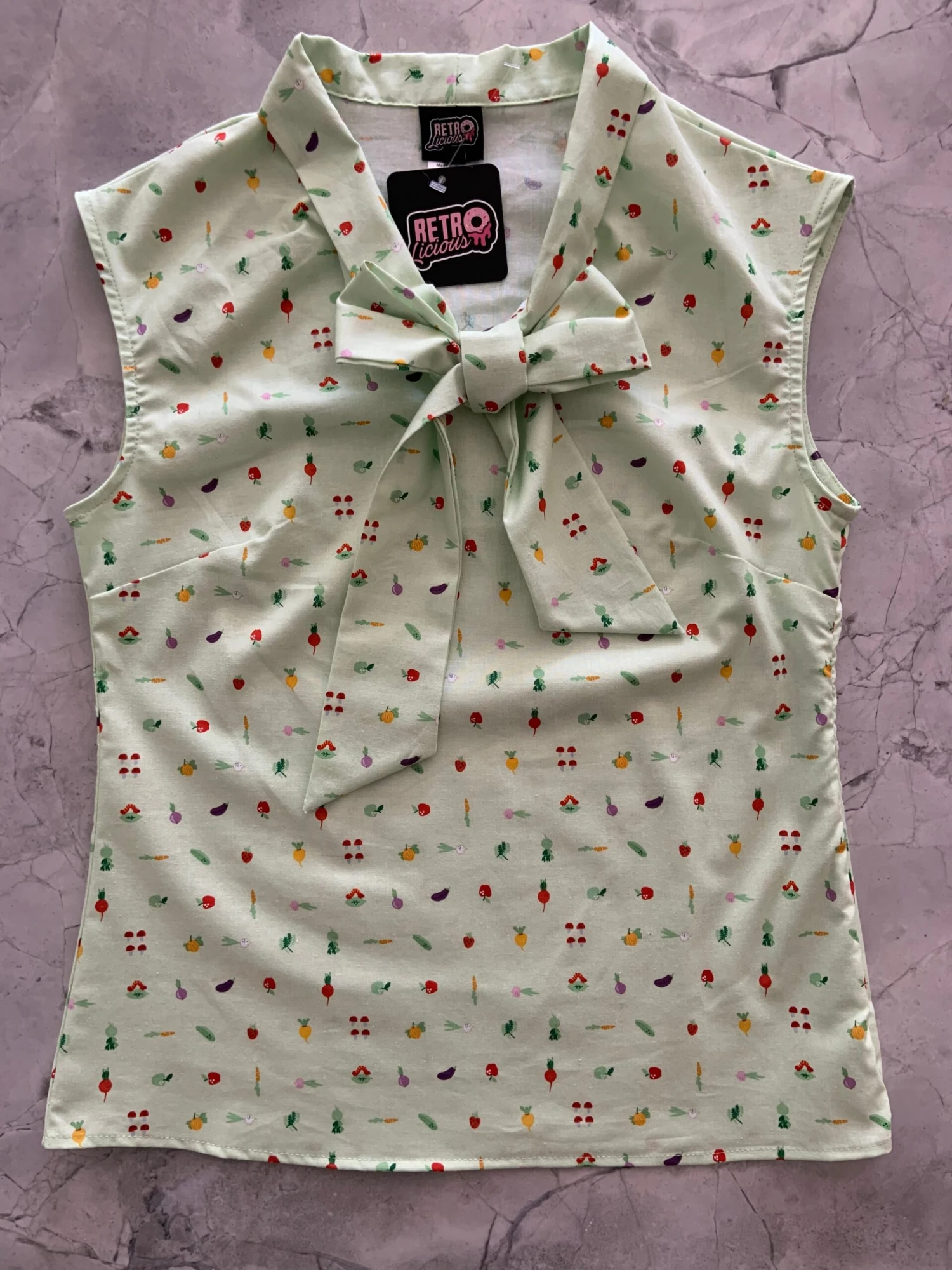 This top is for the veggie lover at heart. Shown in our minty fresh veggies print, this 100% cotton top features bust darts for a flattering silhouette, a side zippered closure for ease of wear, and an oversized bow at the neckline for that perfect 1950’s inspired look. Shown with our Tomato Skater Skirt.